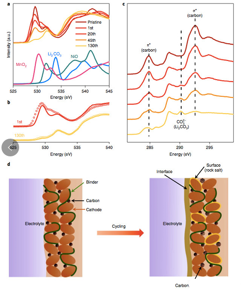 上面我們提到鋰離子電池在循環中富鋰材料的表面非常不穩定,為了分析循環過程富鋰材料表面的結構變化,Enyuan Hu又采用了軟X射線吸收進行了分析,從O K-edge圖中能夠看到,其邊前峰的強度隨著循環次數的增加持續的降低,導致這一現象的原因可能有兩個,一個是富鋰材料的表面層結構從層狀結構向巖鹽結構衰變,第二個原因是富鋰材料電極界面因為電解液分解形成了一層包含Li2CO3, Li2O, LiOH, RCO2Li和R(OCO2Li)2的惰性層,C K-edge分析也發現了富鋰材料電極表面層的Li2CO3的含量在循環中顯著的增加了,這也支持了前面的分析。