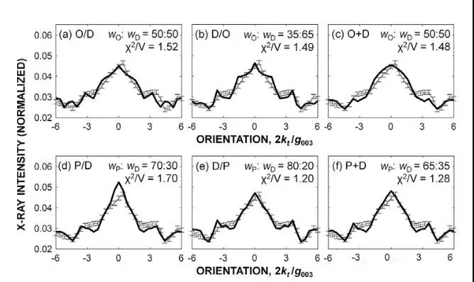 下圖為Yu Yamamoto分別采用O/D、D/O結(jié)構(gòu)模型和O/P/D、D/P/O結(jié)構(gòu)模型對NCA材料的Ni-K曲線進行擬合的結(jié)果,可以從圖中看到采用雙層結(jié)構(gòu)的O/D結(jié)構(gòu)擬合效果并不好,擬合優(yōu)度在1.5左右,而我們在模型中引入部分有序相(P-相)后能夠看到材料的擬合效果明顯提高了,擬合優(yōu)度也提高到了1.3以下(擬合優(yōu)度最大為1,越接近1則表示擬合的越好),表明引入部分有序相的模型能夠更好的模擬實驗結(jié)果。
