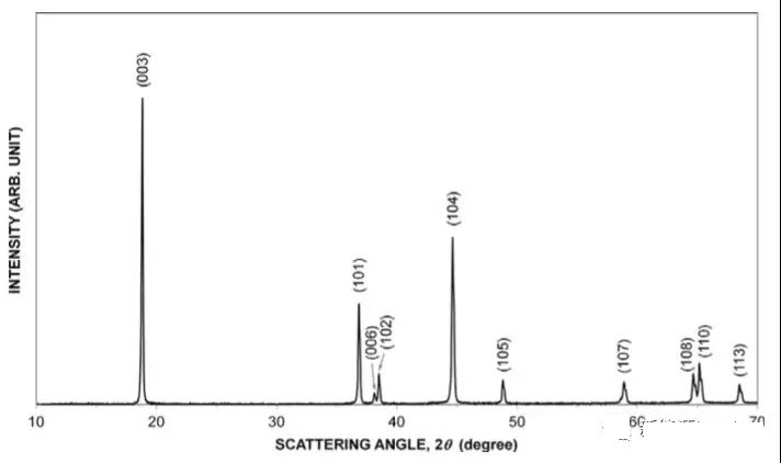 首先Yu Yamamoto利用X射線手段對涂布在Al箔上的NCA材料的結(jié)構(gòu)進行了分析(X射線譜如上圖所示),根據(jù)X衍射數(shù)據(jù)計算可以得到NCA材料的晶胞尺寸在a=2.861A,c=14.17A,由于晶胞參數(shù)中c值對Li/Ni混排比較敏感,而a值對混排并不敏感,而該材料的c/a值為4.95,表明該NCA材料具有高度有序的晶體結(jié)構(gòu),Li/Ni混排比例較低。