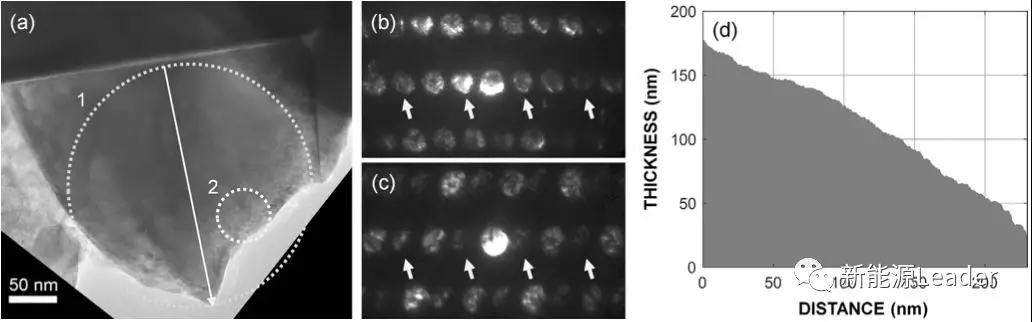 下圖為NCA材料的TEM圖像,圖b和c分別為顆粒中央和邊緣位置的投射、衍射光斑,其中用箭頭標(biāo)出的位置為衍射光斑,當(dāng)NCA從有序?qū)訝罱Y(jié)構(gòu)轉(zhuǎn)變?yōu)闊o序的巖鹽結(jié)構(gòu)時,箭頭表示的光斑結(jié)構(gòu)會逐漸變?nèi)酢⑾В覀儗Ρ阮w粒邊緣(圖c)和中央位置(圖b)的衍射圖案可以發(fā)現(xiàn),顆粒邊緣的衍射光斑亮度較弱,表明可能顆粒邊緣位置的NCA已經(jīng)大部分轉(zhuǎn)變?yōu)闊o序的巖鹽結(jié)構(gòu)。