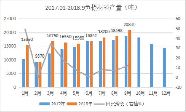 1—9月份負極材料統計產量14.83萬噸,同比增長13.6%,需求增長較為穩健;