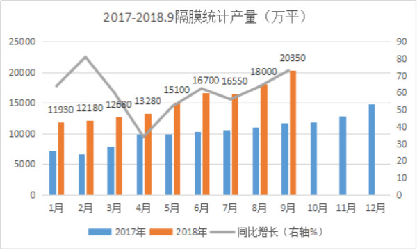 1—9月份隔膜統計產量13.68億平,同比增長60.1%,產量增速遠高于行業平均增速;