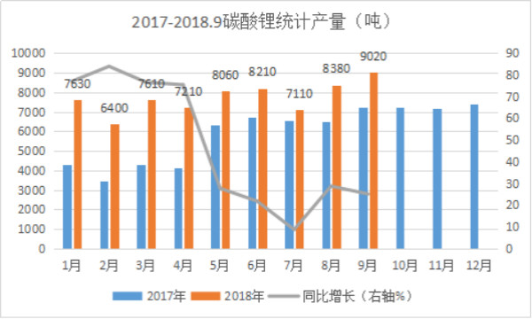 1—9月份碳酸鋰統計產量6.96萬噸,同比大幅增長56.9%,企業增擴產現象明顯;