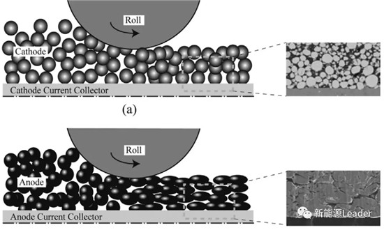 鋰離子電池中常用的正極材料,例如LiCoO2 (LCO)、LiMn2O4 (LMO)、Li(NiCoMn)O2 (NCM) 和 LiFePO4 (LFP)等都具有非常大的硬度因此碾壓的過程中不會發生變形,僅僅是發生了顆粒的重新排布。而石墨負極的顆粒相對比較軟,因此在碾壓過程中會發生塑性變形。這一點能夠從碾壓后的電極SEM照片中得到驗證(如下圖所示),從圖中能夠看到正極在碾壓后顆粒仍然呈現球形的形狀,而負極則已經發生了明顯的變形。因此在負極的碾壓中,不僅要考慮壓實密度對于電極孔隙率等因素的影響,還需要將負極活性物質顆粒在碾壓過程中發生的形變考慮在內。