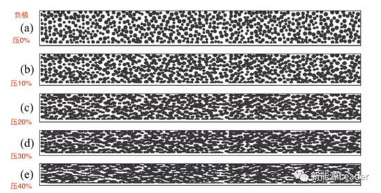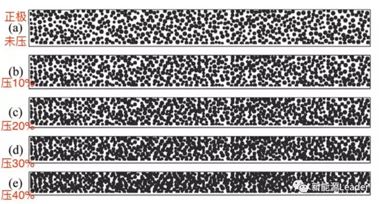 我們假設在碾壓的過程中不會破壞原有的活性物質顆粒,而僅僅會對顆粒之間的空隙大小產生影響,根據上述假設作者構建了正極和負極材料在0%、10%、20%、30%和40%壓實比例下的電極結構(如下圖所示),在碾壓的過程中活性物質顆粒的體積是保持不變的,但是電極之間的空隙體積會持續的降低。同時也正如前面所提到的,在碾壓過程中正極活性物質顆粒保持了球形,而石墨材料在碾壓過程中發生了塑性形變,因此在碾壓比例較高時活性物質顆粒從球形轉變為橢圓形。