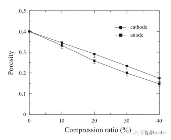 正極和負極在不同的碾壓比例下孔隙率的變化如下圖所示,從圖中能夠看到在未碾壓的狀態電極的孔隙率約為40%,隨著電極碾壓比例的提高,電極的孔隙率快速下降,一般我們認為當電極的碾壓厚度超過40%以后,電極的孔隙率就基本下降到0%,但是該模型預測值卻要明顯高于0,這主要是因為該模型是一個二維模型,因此允許活性物質顆粒之間發生重疊,這也是該模型一個小的缺陷。從下圖中能夠看到在相同的碾壓比例下正極的孔隙率要高于負極,這主要是因為碾壓后正極仍然保持了球形顆粒的形狀,而負極則因為碾壓而發生了塑性形變。