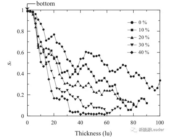下圖為正極在厚度方向上電解液飽和度與距離電極表面距離的關系,從圖中能夠看到隨著距離電極表面距離的增加,電解液的飽和度出現了明顯的下降,表明電極中的電解液隨著距離電極表面的距離增加出現了明顯的減少。其中沒有碾壓的電極這種降低趨勢較慢,表面電解液的浸潤情況較好,而隨著碾壓密度的升高,曲線的降低速度也大大增加,表明壓實密度對于電解液的浸潤有非常大的影響。