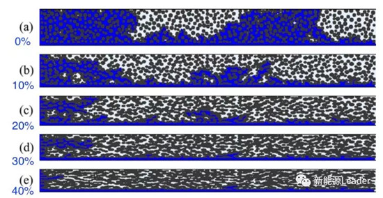 下圖為采用模型得到的不同碾壓比例的正極的電解液浸潤特性,其中藍色部分表示電解液,淺灰色部分表示電極內部的氣體。從下圖a中能夠看到,沒有碾壓的正極材料中電解液擴散到了大部分位置,僅有電極中間部分和尾部留有少量的空氣。當電極碾壓10%后,在相同的時間內從隔膜的擴散的電解液沒有擴散到達正極的底部。隨著碾壓比例的繼續提高,正極中的藍色區域越來越少,表明電解液在電極中的擴散也越來越困難。