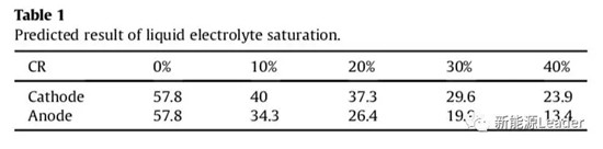 下圖為電解液在不同碾壓比例的負極中的浸潤情況,從圖中能夠看到沒有碾壓的負極同樣浸潤情況較好,從隔膜擴散的電解液能夠到達電極的底部,但是進行碾壓后的電極的浸潤能力就出現了非常大的降低。這主要是因為石墨顆粒在碾壓后出現了塑性變形,因此導致了電極內部出現了大量不聯通的盲孔,影響了電解液在電極內的擴散,下表對比了在相同的碾壓比例下正極和負極電解液飽和度,從表中能夠看到負極經過碾壓后電解液的飽和度更低,表明在相同的碾壓比例時,電解液在負極中擴散更加困難。