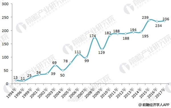 圖表2:1994-2017年我國鋁電解電容器相關(guān)專利申請數(shù)量變化圖(單位:項(xiàng))