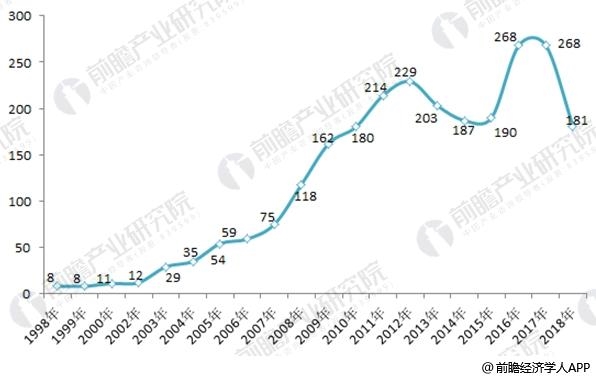 圖表3:1998-2018年鋁電解電容器相關(guān)專利公開數(shù)量變化圖(單位:項(xiàng))