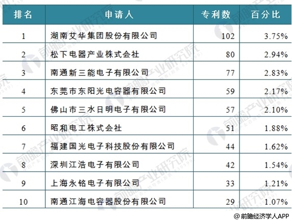 圖表4:截至2018年5月底鋁電解電容器相關(guān)專利申請人構(gòu)成情況(前十位)(單位:項(xiàng))