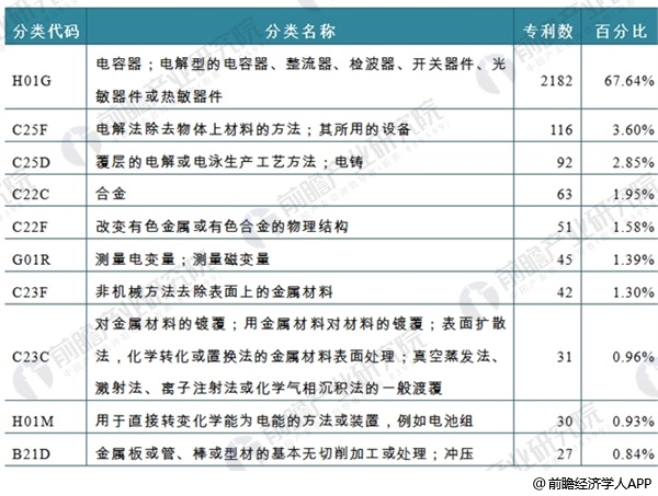 從我國鋁電解電容器行業(yè)公開專利技術(shù)分布來看,H01G類(電容器;電解型的電容器、整流器、檢波器、開關(guān)器件、光敏器件或熱敏器件)的分布量最多,共擁有2184項(xiàng)專利技術(shù),占整個(gè)鋁電解電容器專利數(shù)量的67.64%;其次是C25F類(電解法除去物體上材料的方法;其所用的設(shè)備),共公開116項(xiàng);C25D類的公開量為91項(xiàng),位居第三。具體專利分布情況如下表所示: