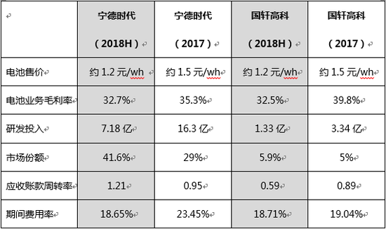 由于寧德時代和國軒高科動力電池業務比較純粹,新浪財經選取行業第一和第三的這兩家公司,通過從電池售價、電池成本、毛利率水平、市場份額、研發投入、應收賬款(現金流)以及期間費用等指標的對比,或許從中能夠窺見龍頭公司經營情況的一些端倪。