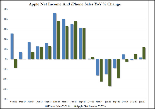 2013年第四季度以來蘋果每季凈利潤(綠色柱狀圖),和iPhone銷售額(藍色柱狀圖)的同比增長變化(圖:華爾街見聞)