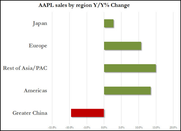 蘋果各地區銷售額,大中華區比上一季下降了9.5%圖:華爾街見聞)