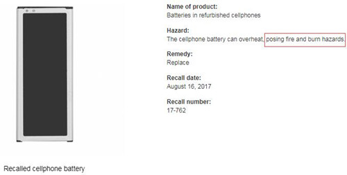 電池可能會過熱、起火,帶來燒傷危險。用戶應當立即停止使用需要召回的電池,并關(guān)閉智能手機。