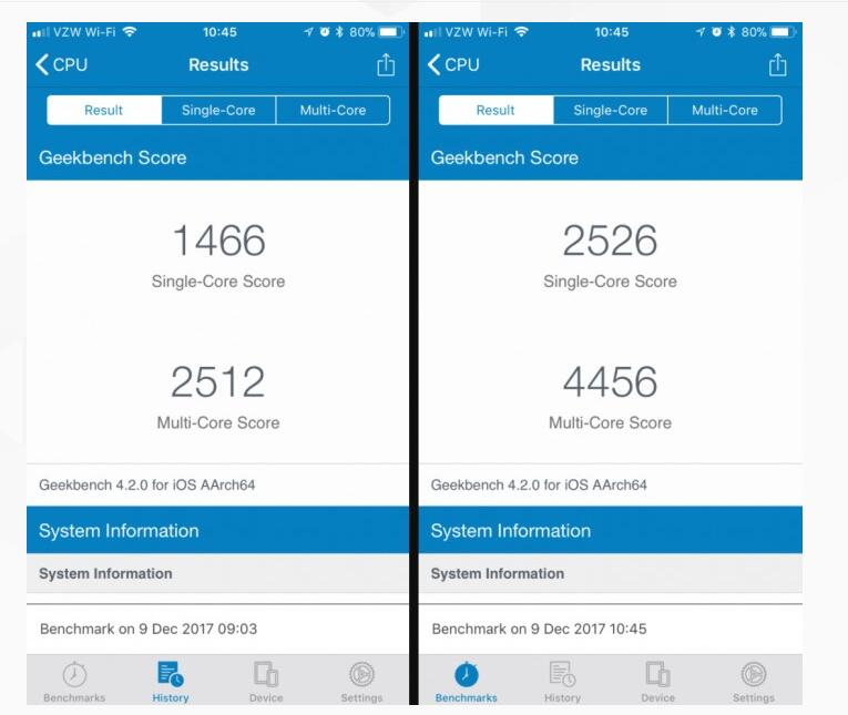 當他更換全新電池后,他發現Geekbench性能跑分提升至單核2526分/多核4456分。而相同iPhone前后不同的只有電池部分,兩次測試均未開啟省電模式。據說這與去年蘋果iPhone 6S出現電量非預期關機的故障,蘋果通過電池更換計劃以及iOS 10.2.1更新來進一步解決此問題。有網友認為,iOS 10.2.1更新后,蘋果可能通過動態降低機型的芯片主頻,來降低對老電池的負荷,來讓這些設備減少非正常關機和過量電池損耗的問題。當然僅憑該用戶的個例并不能說明問題或者存在普遍情況,具體原因仍有待更多例子和測試證明。 (責任編輯:admin)