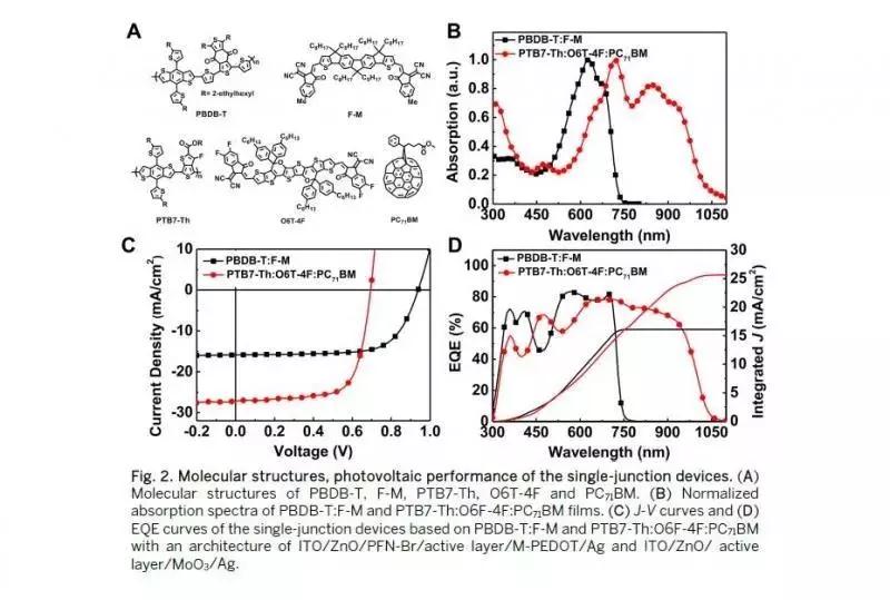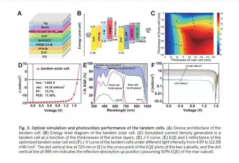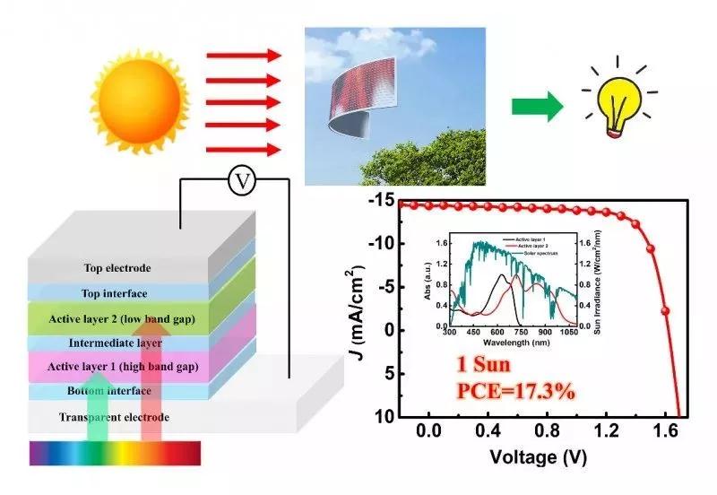陳永勝教授團隊與中科院國家納米科學中心丁黎明研究員、華南理工大學葉軒立教授研究團隊合作,首先利用半經驗模型,從理論上預測了有機太陽能電池實際可以達到的最高效率和理想活性層材料的參數要求。在此基礎上,他們以在可見光區域和近紅外區域具有良好互補吸收的PBDB-T:F-M和PTB7-Th:O6T-4F:PC71BM分別作為前電池和后電池的活性層材料,采用成本低廉與工業化生產兼容的溶液加工方法制備得到了高效的有機太陽能墊層器件,獲得了17.3%的驗證效率。