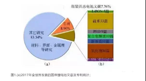 2017 年,關于固態鋰電池分別有 1198 篇文獻與 117 篇專利,其中 1096 篇文獻集中在金屬鋰負極、固態電解質以及固態電解質與正負極界面等基礎問題研究。