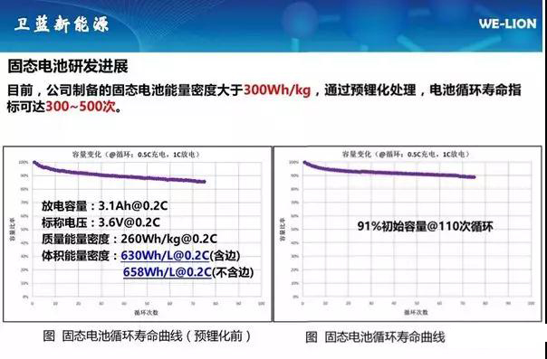 目前容量為 325 mAh能量密度為 300 Wh/kg 的聚合物鋰金屬固態電池 300 周循環以上剩余 82%。
