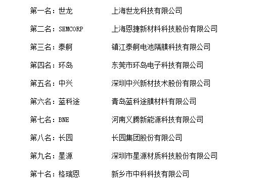電池隔膜十大品牌”榜單的優秀企業和品牌如下: