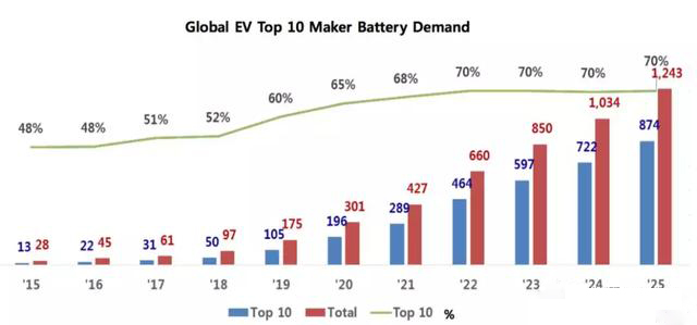 動(dòng)力電池的市場(chǎng)需求會(huì)隨著電動(dòng)汽車產(chǎn)業(yè)的發(fā)展快速發(fā)展,預(yù)計(jì)在2025年動(dòng)力電池的市場(chǎng)需求將達(dá)到1243GWh,年復(fù)合增長率達(dá)到46%,全球前十大電動(dòng)汽車生產(chǎn)商(大眾、日產(chǎn)、通用、豐田、現(xiàn)代、特斯拉、FCA、本田、BYD)的動(dòng)力電池需求量將達(dá)到874GWh,占整個(gè)需求量的70%左右,表明電動(dòng)汽車行業(yè)競(jìng)爭(zhēng)會(huì)持續(xù)加劇,產(chǎn)業(yè)聚集度將會(huì)持續(xù)增加。