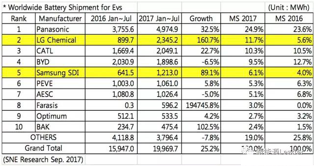 隨著動(dòng)力電池的行業(yè)的快速增長,廣大動(dòng)力電池廠商的角力也已經(jīng)開始,從2017年前7個(gè)月的出貨量來看(SNE research的調(diào)查數(shù)據(jù)),中、日、韓三國企業(yè)是動(dòng)力電池市場(chǎng)的絕對(duì)主角,松下依然處于絕對(duì)領(lǐng)先地位,2017前前7個(gè)月出貨量相比2016年增長32.5%,2017年市場(chǎng)份額比2016年提高1.3%,達(dá)到24.9%。處于第二梯隊(duì)的是韓國的LG化學(xué)、中國的CATL和BYD,特別是LG在2017年出貨量實(shí)現(xiàn)了大幅度增加160.7%,市場(chǎng)份額增加超過一倍達(dá)到11.7%,緊隨其后的CATL穩(wěn)扎穩(wěn)打出貨量增加22.7%,市場(chǎng)份額小幅降低,為10.3%。但是比亞迪在2017年前7個(gè)月的出貨量反倒是出現(xiàn)了降低,市場(chǎng)份額出現(xiàn)了小幅降低,小編認(rèn)為這可能與BYD的鋰離子電池僅僅供應(yīng)自家電動(dòng)汽車有關(guān),隨著BYD動(dòng)力電池開始供應(yīng)其他電動(dòng)汽車廠商,這一狀況相信會(huì)有很大的改觀。