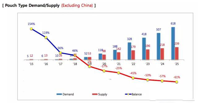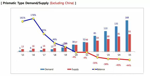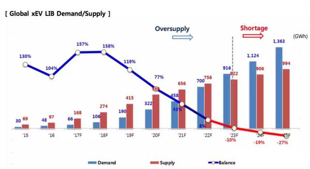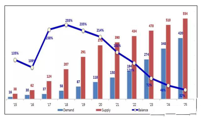 雖然動(dòng)力電池在未來會(huì)有巨大的市場(chǎng)需求,但是從短期來看,動(dòng)力電池還將繼續(xù)面臨產(chǎn)能過剩的困擾,2017年動(dòng)力電池產(chǎn)能過剩達(dá)到157%,此后隨著需求的增加,產(chǎn)能過剩的情況將有所改善,但是直到2023年產(chǎn)能過剩的現(xiàn)象才會(huì)得到徹底解決,2023年動(dòng)力電池的市場(chǎng)需求,將首次超過供給,并且這一缺口將達(dá)到10%,并且產(chǎn)能不足的狀況會(huì)持續(xù)加劇,2025年這一缺口將達(dá)到27%。