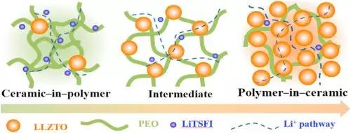 為了平衡這兩種效應,Goodenough采用水凝膠衍生的方法構建了3D -LLZTO /PEO復合電解質。他們將LLZTO融入水凝膠模板中然后除去模板,再用PEO進行澆鑄干燥[3]。