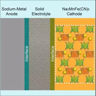 在此基礎上,Goodenough團隊選擇了鈉離子固態(tài)導體NASICON作為固態(tài)電解質組裝了高比能全固態(tài)Na/NASICON/Na2MnFe(CN)6鈉電池[6]。固態(tài)電解質的應用從根本上抑制了晶格水與液態(tài)電解液在高電位下的副反應,過渡金屬離子也不再與電解液溶劑配位溶解。相比液態(tài)電池體系,固態(tài)電池的鈉負極界面上由于副反應減少而保持著良好的離子傳輸,相應的電池庫倫效率和循環(huán)穩(wěn)定性都有明顯的改善。