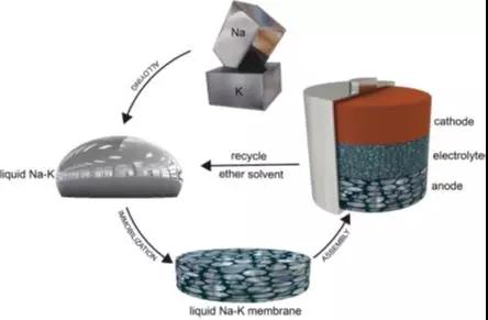 在對電解質進行優(yōu)化的同時,Goodenough另辟蹊徑地利用液態(tài)合金負極有效解決了電極-電解質界面的不相容問題和枝晶生長問題。金屬鈉與金屬鉀室溫下在較寬的比例范圍內能夠形成液態(tài)合金。以此液態(tài)金屬作為二次電池負極,可以利用液體的流動性質和自愈性質實現(xiàn)無枝晶的負極界面。
