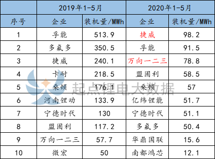 與去年同期相比,top10企業格局變動較大,孚能、多氟多、捷威、桑頓、寧德時代、盟固利、萬向一二三7家企業還在榜單,卡耐、河南鋰動、微宏動力則掉出前十,億緯鋰能、華鼎國聯和南都鴻芯新進入前十。