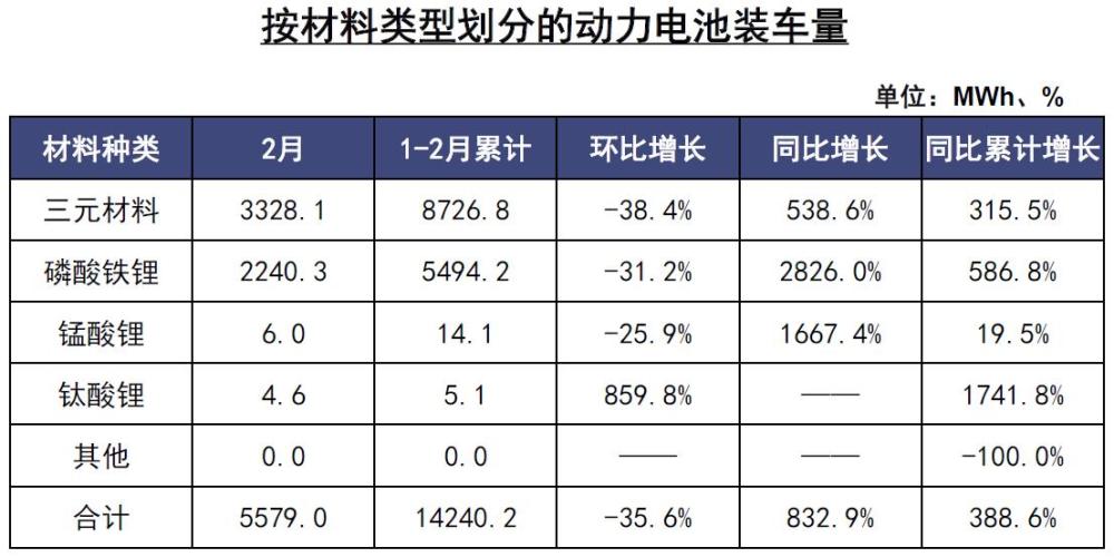 2月,動力電池裝車量5.6GWh,同比上升832.9%,環(huán)比下降35.6%。其中三元電池共計裝車3.3GWh,同比上升538.6%,環(huán)比下降38.4%;磷酸鐵鋰電池共計裝車2.2GWh,同比上升2826%,環(huán)比下降31.2%。