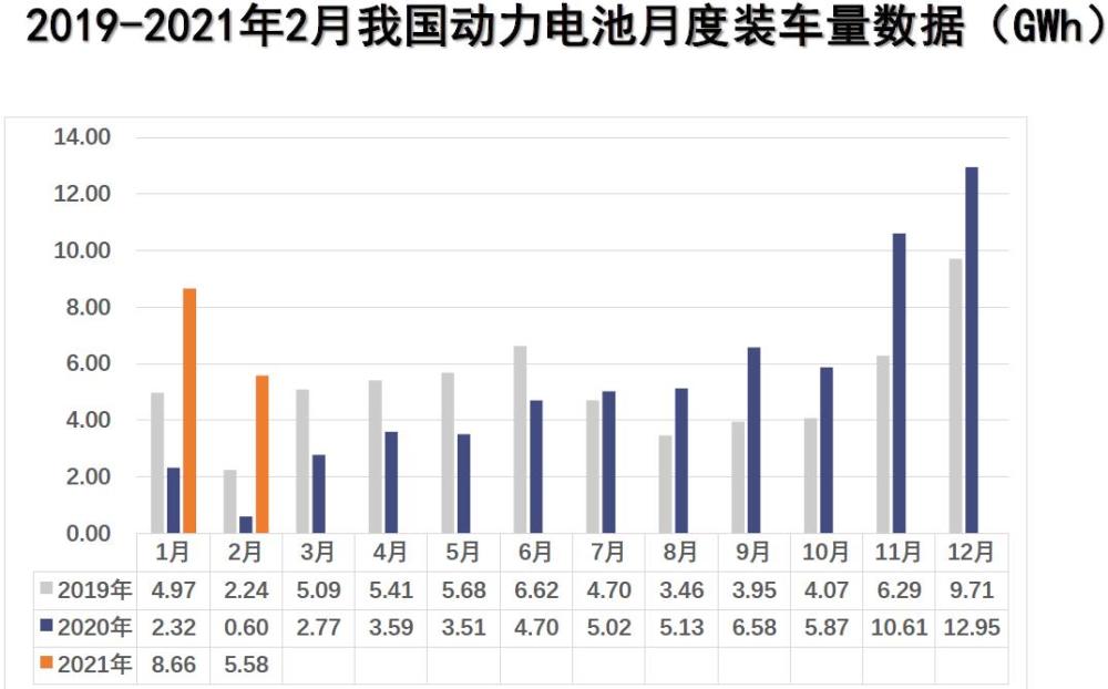 今年前2個月,動力電池裝車量累計14. 2GWh,同比增長388.6%。其中三元電池裝車量累計8.7GWh,占總裝車量61.3%,同比累計增長315.5%;磷酸鐵鋰電池裝車量累計5.5GWh,占總裝車量38.6%,同比累計增長586.8%,呈現(xiàn)快速增長發(fā)展勢頭。