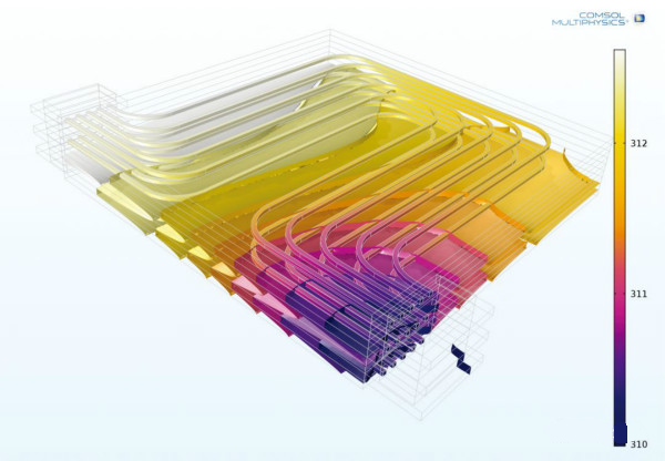 圖 1. 液冷式電池組溫度曲線的多物理場仿真結果。流體流動和溫度取自三維模型,集總的一維模型被用于計算鋰離子電池的熱源。