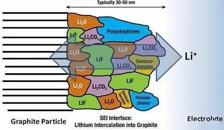 在液態鋰離子電池首次充放電過程中,電極材料與電解液在固液相界面上發生反應,形成一層覆蓋于電極材料表面的鈍化層。形成的鈍化層膜能有效地阻止電解液分子的通過,但Li+ 卻可以經過該鈍化層自由地嵌入和脫出,具有固體電解質的特征,因此這層鈍化膜被稱為“固體電解質界面膜”( solid electrolyte interface) ,簡稱SEI。SEI膜對負極材料會產生保護作用,使材料結構不容易崩塌,并且可以增加電極材料的循環壽命。SEI膜并非一成不變,在充放電過程中會有少許的變化,主要是部分有機物會發生可逆的變化。電池過度放電后使得SEI膜發生可逆性破環,保護負極材料的SEI破壞后使得負極材料崩塌,從而形成鼓包現象。