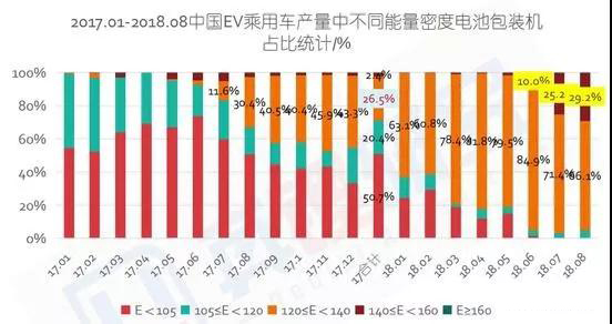 2017-2018.8中國電動汽車乘用車產量中不同能量密度電池包的裝機占比 來源:真鋰研究