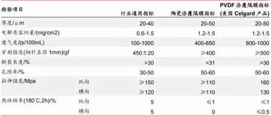 常規(guī)隔膜與涂覆隔膜的物理性能指標(biāo)對(duì)比