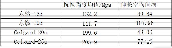 1)抗張強(qiáng)度:隔膜的抗張強(qiáng)度與膜的制作工藝有關(guān)。拉伸強(qiáng)度:MD tension,TD tension東燃隔膜的抗拉強(qiáng)度要小于celgard,但伸長量要大于celgard。