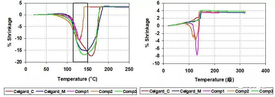 4)熱穩(wěn)定性。 電池在充放電過程中會(huì)釋放熱量,尤其在短路或過充電的時(shí)候,會(huì)有大量熱量放出。因此,當(dāng)溫度升高的時(shí)候,隔膜應(yīng)當(dāng)保持原來的完整性和一定的機(jī)械強(qiáng)度,繼續(xù)起到正負(fù)電極的隔離作用,防止短路的發(fā)生。TMA(thermal mechanical analysis) 技術(shù)是測(cè)量高溫時(shí)隔膜完整性的方法,它可測(cè)出隔膜形狀隨溫度的變化。TMA是測(cè)量溫度直線上升時(shí)隔膜在荷重時(shí)的形變,通常隔膜先表現(xiàn)出皺縮,然后開始伸長,最終斷裂。