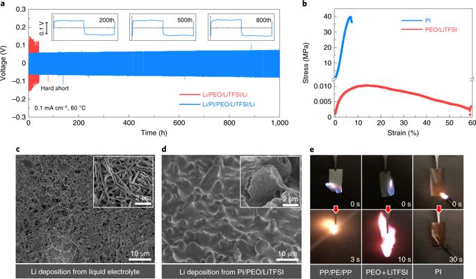 由于PI膜不易燃,力學強度高,即使經過1000多小時的循環,也可持續防止電池短路,保證安全性。垂直通道可提高注入的離子電導率(30°C時為2.3×10-4 S cm-1),基于PI / PEO / LiTFSI固體電解質制造的全固態鋰離子電池在60°C時具有良好的循環性能(C / 2速率下200次循環),并可承受彎曲,切割和釘子穿透等測試。
