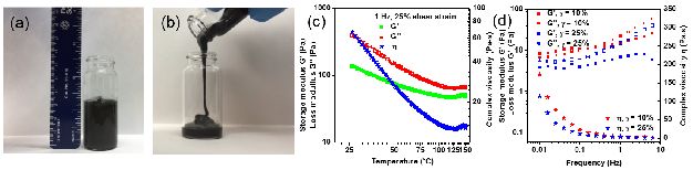 圖3. (a)大約15 g復(fù)合電極材料SLMA實(shí)物圖。(b)復(fù)合電極SLMA于120 oC呈流體狀從容器中倒出。(c)&(d)復(fù)合電極材料SLMA在不同溫度和頻率下的剪切模量與粘度變化。