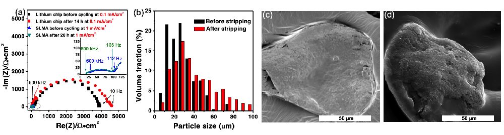 圖5. (a)對稱電池的電化學(xué)阻抗譜。(b)SLMA在電化學(xué)剝離前后的鋰微米顆粒粒徑變化。(c)&(d)鋰微米顆粒在電化學(xué)沉積前后的表面SEM圖。