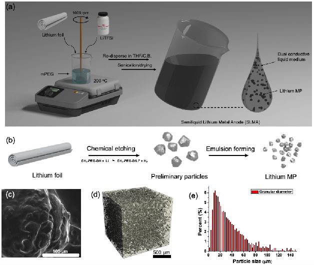 圖2. (a) 復(fù)合鋰電極材料(SLMA)制備示意圖。(b)鋰金屬微米顆粒形成機(jī)理。(c)聚合物包覆鋰金屬微米顆粒的SEM照片。(d)微米級計(jì)算機(jī)斷層成像圖。(e)鋰金屬微米顆粒在復(fù)合材料中的尺寸分布。