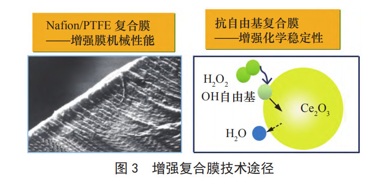 從圖1可見,提高性能除了要通過提高催化劑活性降低活化極化外,隨著電流增大,伏安曲線直線段的斜率主要是歐姆極化決定的,其中膜的歐姆極化占有主要份額。為了提高性能,目前車用質(zhì)子交換所用的膜逐漸趨于薄型化,由幾十微米降低到十幾微米或以下,以降低質(zhì)子傳遞的歐姆極化,獲得較高的性能。但是薄膜在車載運(yùn)行工況下(如操作壓力、干濕度、溫度等操作條件的動態(tài)變化)更容易受到機(jī)械損傷與化學(xué)降解。復(fù)合膜是由均質(zhì)膜改性而來的,它利用均質(zhì)膜的樹脂與有機(jī)或無機(jī)物復(fù)合使其比均質(zhì)膜在某些功能方面得到強(qiáng)化。因此,增強(qiáng)復(fù)合薄膜是解決薄膜應(yīng)用的主要解決方案。增強(qiáng)復(fù)合膜既保證了薄膜的性能又使其機(jī)械強(qiáng)度及化學(xué)耐久性得到強(qiáng)化,其實(shí)現(xiàn)的技術(shù)途徑一是機(jī)械增強(qiáng);二是化學(xué)增強(qiáng)(見圖3)。
