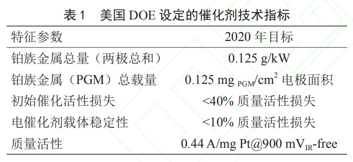 從燃料電池極化曲線可以看出,提高燃料電池性能首先要降低活化極化,而活化極化主要與催化劑活性密切相關(guān)。燃料電池在反應(yīng)過程中,由于氧還原反應(yīng)(ORR)的交換電流密度遠(yuǎn)低于氫氧化反應(yīng)(HOR),一般極化損失主要來自于陰極側(cè)(空氣側(cè))。因此,研究焦點(diǎn)是提高陰極側(cè)催化劑的活性。目前,質(zhì)子交換膜燃料電池中常用的商用催化劑是鉑炭催化劑(Pt/C),是由 Pt 的納米顆粒分散到碳粉(如 XC-72)載體上的擔(dān)載型催化劑,實(shí)際使用測試發(fā)現(xiàn)這種商用催化劑在活性、穩(wěn)定性等方面都存在一定不足。美國能源部(DOE)催化劑指標(biāo)如表1所示,研究者通過Pt晶面控制、Pt-M合金催化劑、Pt-M核殼催化劑、Pt表面修飾、Pt單原子層催化劑等多種途徑探索高活性、高穩(wěn)定性催化劑的解決方案,在這些研究中目前可以實(shí)際應(yīng)用的只有Pt-M合金催化劑。
