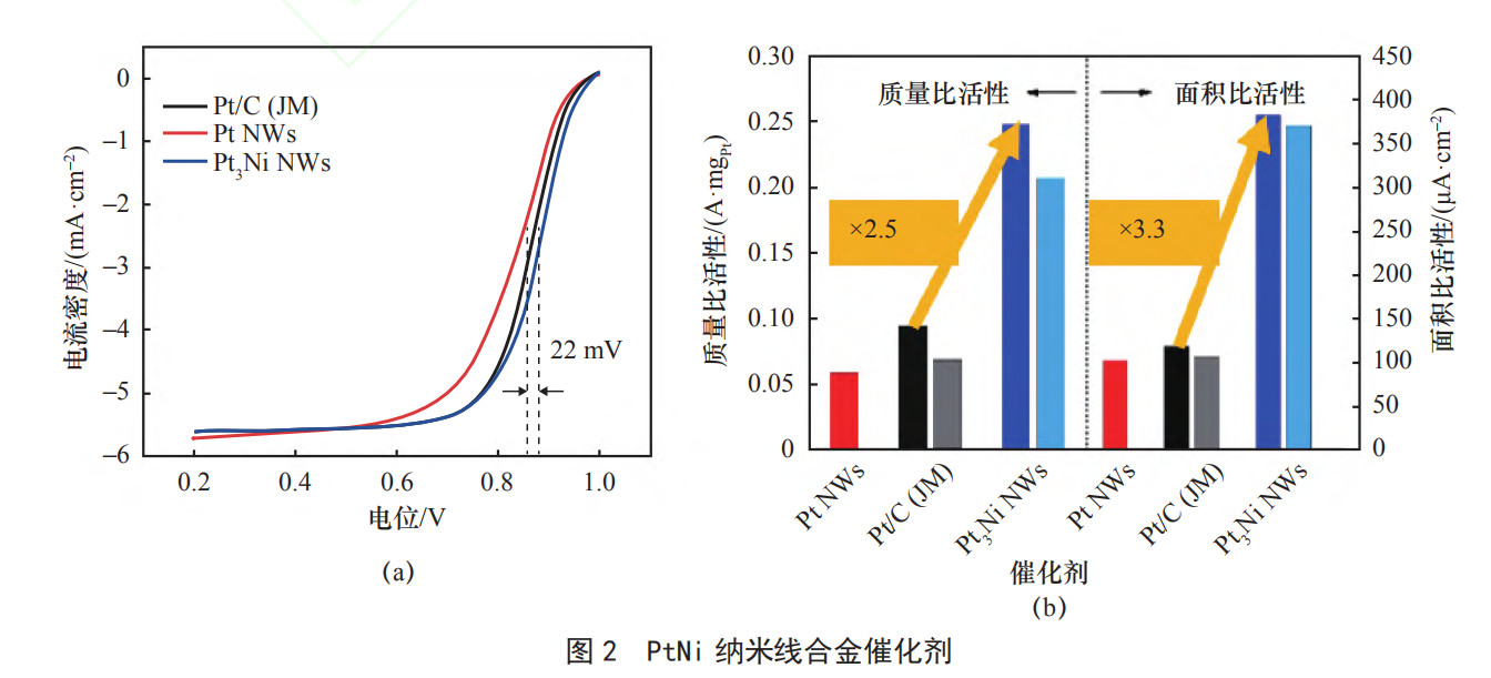 Pt-M催化劑是Pt與過渡金屬形成的合金催化劑,通過過渡金屬催化劑對Pt的電子與幾何效應(yīng),在提高穩(wěn)定性的同時(shí),質(zhì)量比活性也有所提高;同時(shí),降低了貴金屬的用量,使催化劑成本也得到大幅度降低。 如Pt-Co/C、Pt-Fe/C、Pt-Ni/C等二元合金催化劑,展示出了較好的活性與穩(wěn)定性。Chen 等人利用鉑鎳合金納米晶體的結(jié)構(gòu)變化,制備了高活性與高穩(wěn)定性 Pt3Ni 納米籠催化劑,其質(zhì)量比活性與面積比活性分別提高36倍與22倍。在Pt合金催化劑應(yīng)用方面,豐田汽車公司披露了在所發(fā)布的商業(yè)化燃料電池車Mirai上就是采用了Pt-Co合金催化劑,使其催化劑活性提高了1.8倍。中國科學(xué)院大連化學(xué)物理研究所(大連化物所)開發(fā)的Pt3Pd/C催化劑已經(jīng)在燃料電池電堆得到了驗(yàn)證,其性能可以完全替代商品化催化劑;此外,大連化物所還研制出了超小PtCu合金催化劑,其質(zhì)量比活性是目前Pt/C的3.8倍;PtNi 納米線合金催化劑質(zhì)量與面積比活性分別達(dá)到Pt/C的2.5倍和 3.3 倍(見圖2),展示了較好的應(yīng)用前景。