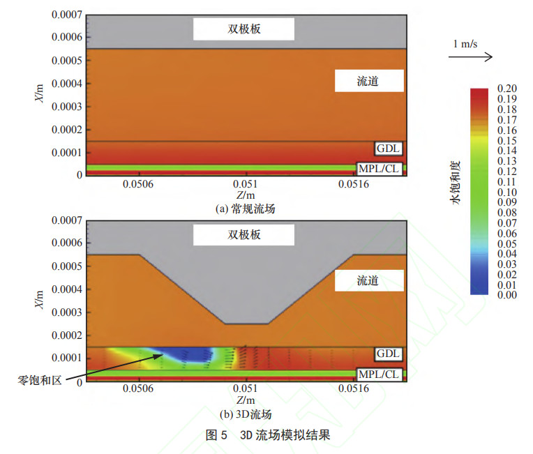 通過模擬計(jì)算可以更進(jìn)一步證實(shí)3D流場強(qiáng)化了流道、擴(kuò)散層的排水能力(見圖 5,3D 流場在擴(kuò)散層內(nèi)出現(xiàn)了水的零飽和區(qū)),同時(shí)增加了氧氣在催化層的強(qiáng)制對流,尤其在高電流時(shí)與2D常規(guī)平行溝槽流場比較,燃料電池性能有了很大的提升。