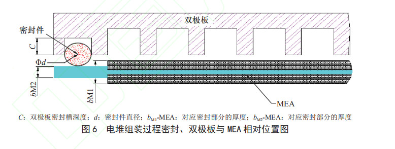 電堆組裝過程通常是在壓力機(jī)上進(jìn)行的,一般是依據(jù)一定的組裝順序及定位方法,把MEA與雙極板摞裝起來并附以集流板、端板,通過緊固裝置固定形成一個(gè)完整的電堆。電堆組裝除了要保證電堆密封性外,還要保證 MEA 與雙極板界面的良好接觸。電堆設(shè)計(jì)階段要考慮電堆密封元件形變與MEA 形變的匹配,在組裝過程中通過控制電堆高度定量雙極板向膜電極擴(kuò)散層中嵌入深度,并同時(shí)使密封元件達(dá)到預(yù)定的變形量。圖6為電堆組裝過程密封件、雙極板與 MEA 相對位置圖,電堆組裝高度為h=h1=h2,其中h1為滿足MEA壓深以獲得預(yù)期較小接觸電阻的組裝高度;h2為滿足密封變形要求的組裝高度,一般通過離線試驗(yàn)可以確定獲得較小接觸電阻 MEA 的壓深率 fM 和密封件壓縮率fr,密封件壓縮率fr根據(jù)密封結(jié)構(gòu)與材料可在一定范圍內(nèi)調(diào)整(如30%~60%)。